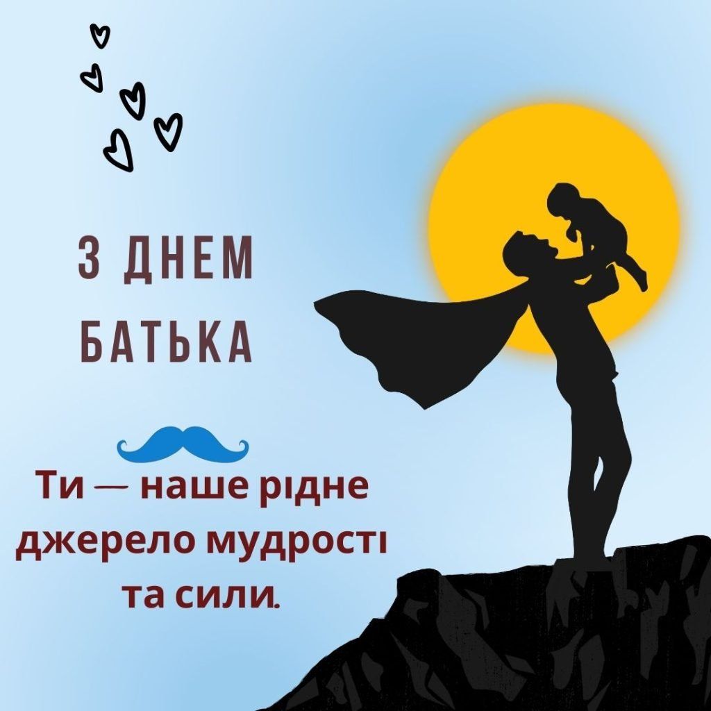 Татусю, вітаю тебе з Днем батька! Ти — найкращий друг і наставник для мене. Спасибі за те, що завжди був поруч і підтримував. Бажаю тобі здоров’я, удачі та гармонії в житті. Нехай твоя душа завжди буде спокійною, а серце радісним!